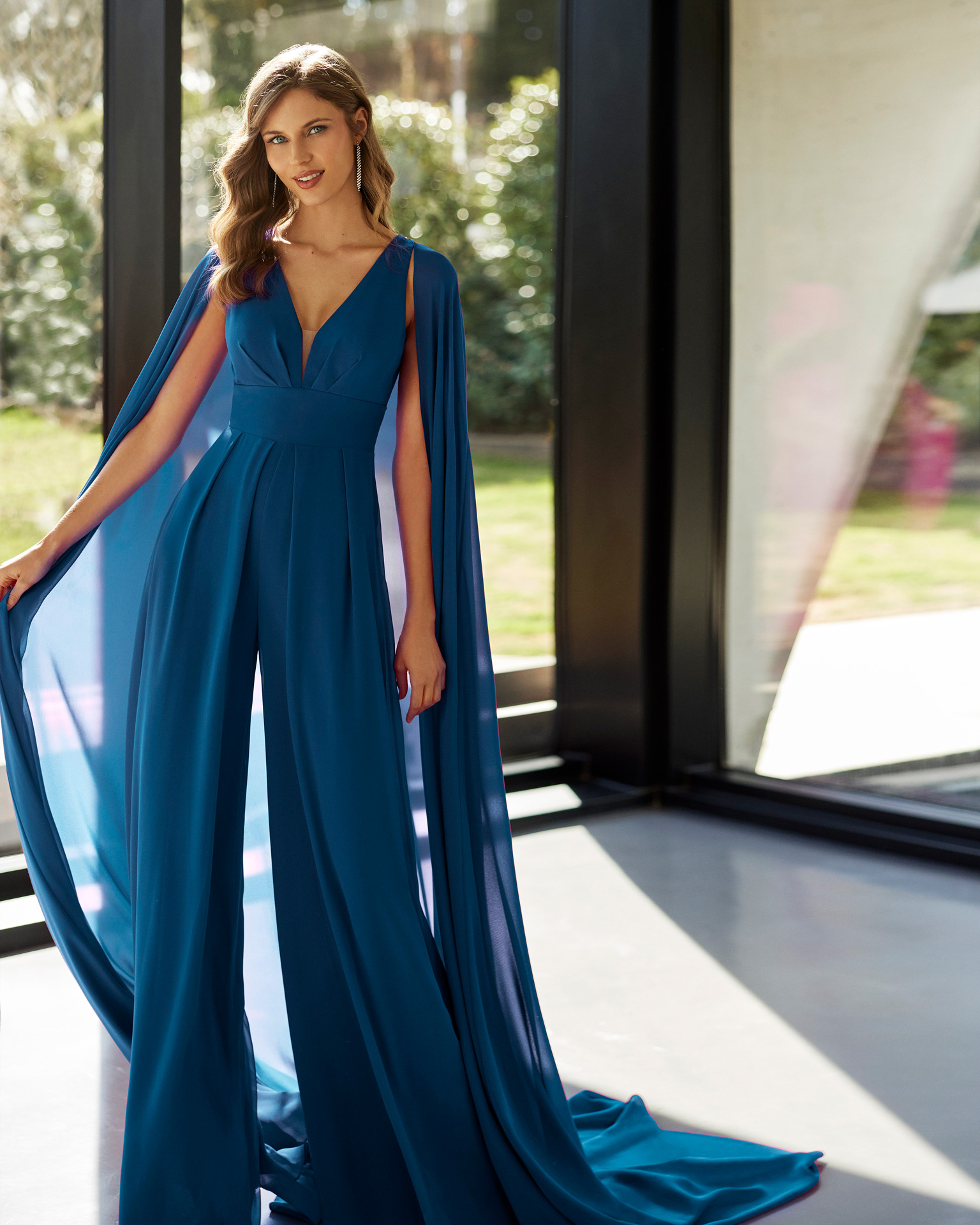 Vestido de madrina largo y estilo elegante. Elaborado con georgette. Con escote pico, espalda cerrada y Capa de georgette.