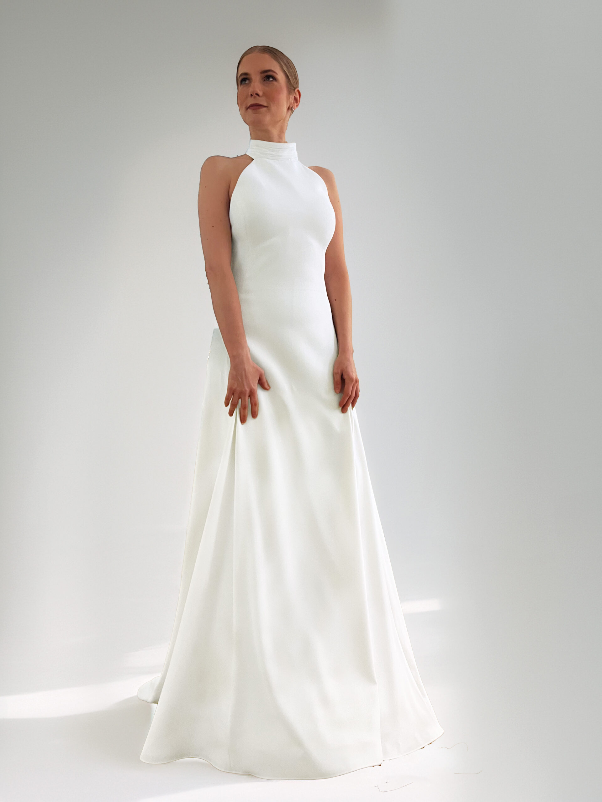 Vestido de novia con escote halter, espalda en V con drapeado y alas de seda desmontables sujetas al cuello. La falda incorpora tres godets que aportan una caída muy fluida y sofisticada. Confeccionado en un tejido mate y suave, con finísimas líneas apenas perceptibles. El patrón está pensado para ceñirse al cuerpo y estilizar la figura.